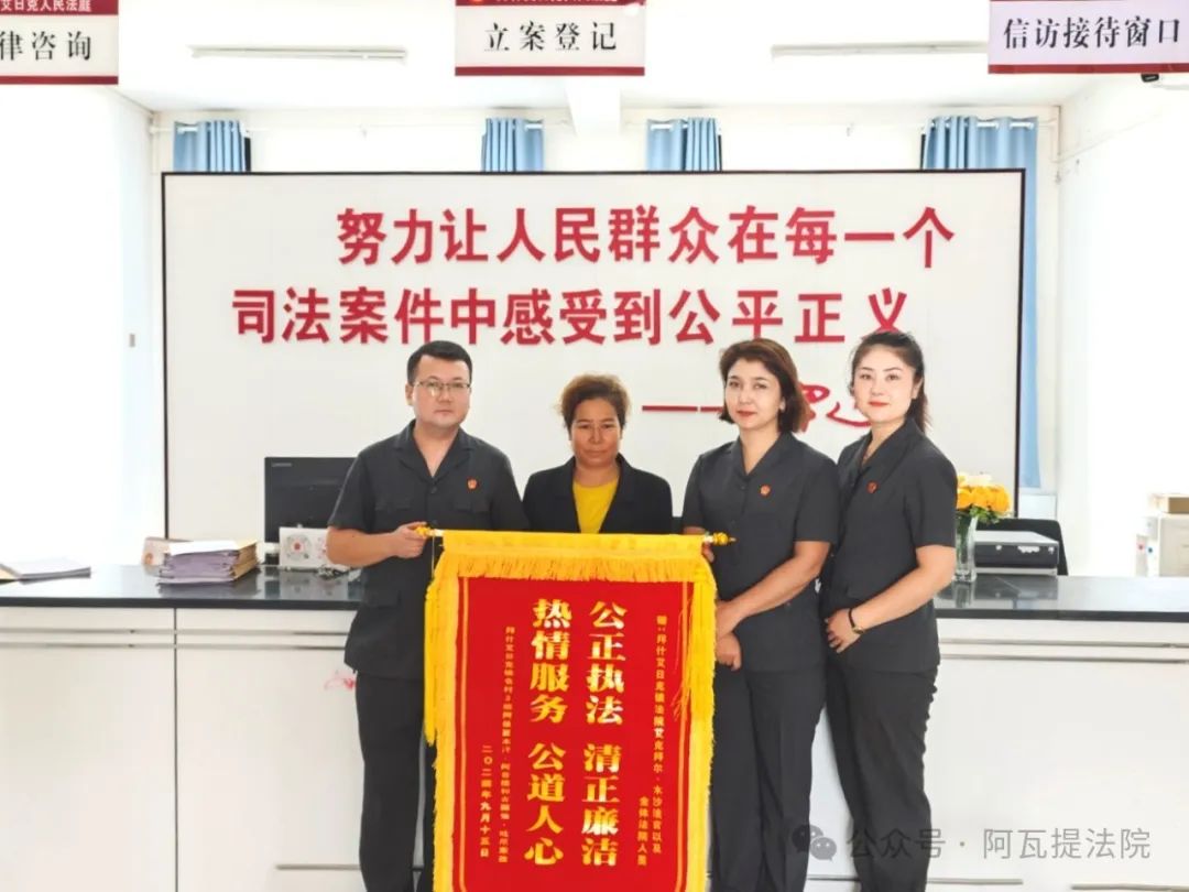 在法治社会的每一个角落,基层人民法庭都是公平正义的坚 实守护者。法庭承载着群众的期待与信任,用法律的力量守护着每一个人的合法权益。近日,新疆维吾尔自治区阿瓦提县人民法院拜什艾日克法庭收到了一面当事人古某送来的写着“热情服务 公道人心 公正执法 清正廉洁”的锦旗,简单的字句是对法庭干警办案尽心高效的 最高赞誉,也是对法庭干警坚守法治初心的最好肯定。